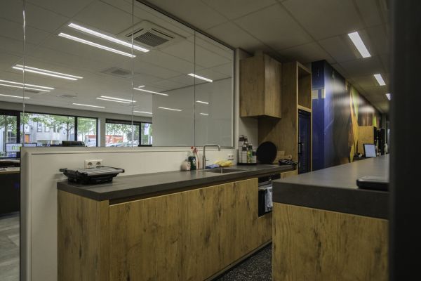 Medewerkers en relaties treffen elkaar steeds vaker in de bedrijfskantine. Het creëren van een sfeervolle ruimte waarin niet alleen een kop koffie gedronken kan worden is mede mogelijk gemaakt door deze keuken gemaakt van natuurlijke en duurzame materialen.