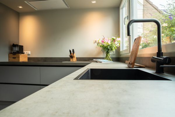 De afzuigkap is netjes in een op maat gemaakte koof geplaatst waardoor de lichtinval optimaal is gebleven. In deze volledige greeploze keuken met supermatte fronten is gekozen voor moderne inbouwapparatuur. De smetrand op het aanrechtblad zorgt ervoor dat er bij het schoonmaken van het blad geen vieze vegen van het schoonmaakdoekje achterblijven op de achterwand. Daarnaast is dit een mooie opvulling van het aanrechtblad naar de onderzijde van de vensterbank.